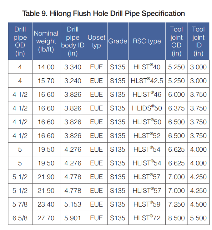 Decreasing the hydro pressure loss to improve the hydro-efficiency is the key to improve drilling speed. Shanghai Hilong's proprietary flush-hole drill pipe is designed to be made-up with the drill pipe body using a special external upset with a large ID and the tool joint with Hilong double shouldered connections with a large ID also. The ID of the upset end and the tool joint are almost the same as that of the drill pipe body.
