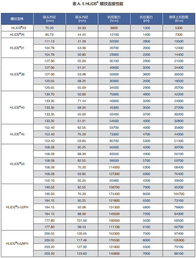 (a)HLIDS® 系列包括 HLIDS®23、HLIDS®26、HLIDS®31、HLIDS®38、HLIDS®40、HLIDS®46、HLIDS®50、HLIDS®5 1/2FH 和 HLIDS®6 5/8FH 等規(guī)格,適用于 2 3/8"-6 5/8" 所有API 標(biāo)準(zhǔn)鋼級和規(guī)格的鉆桿。